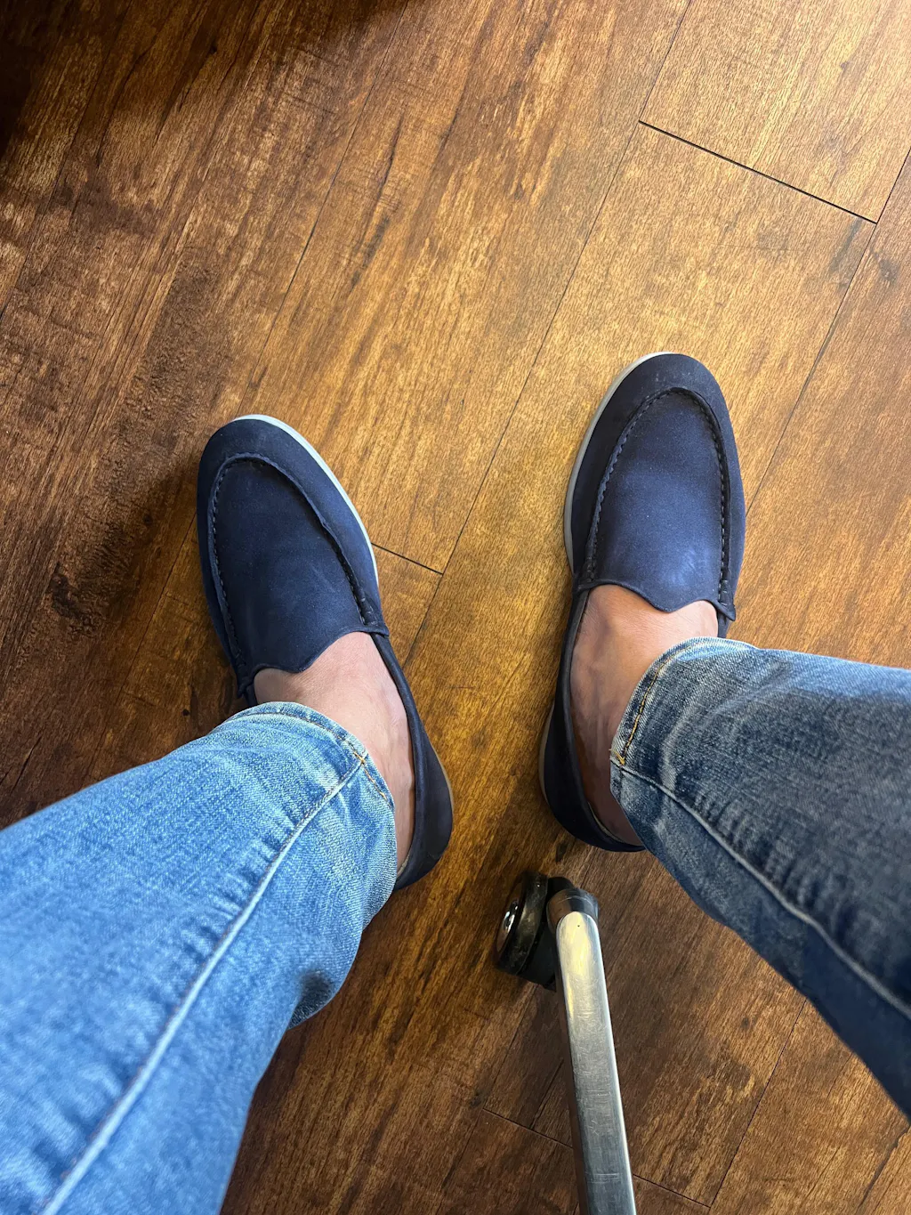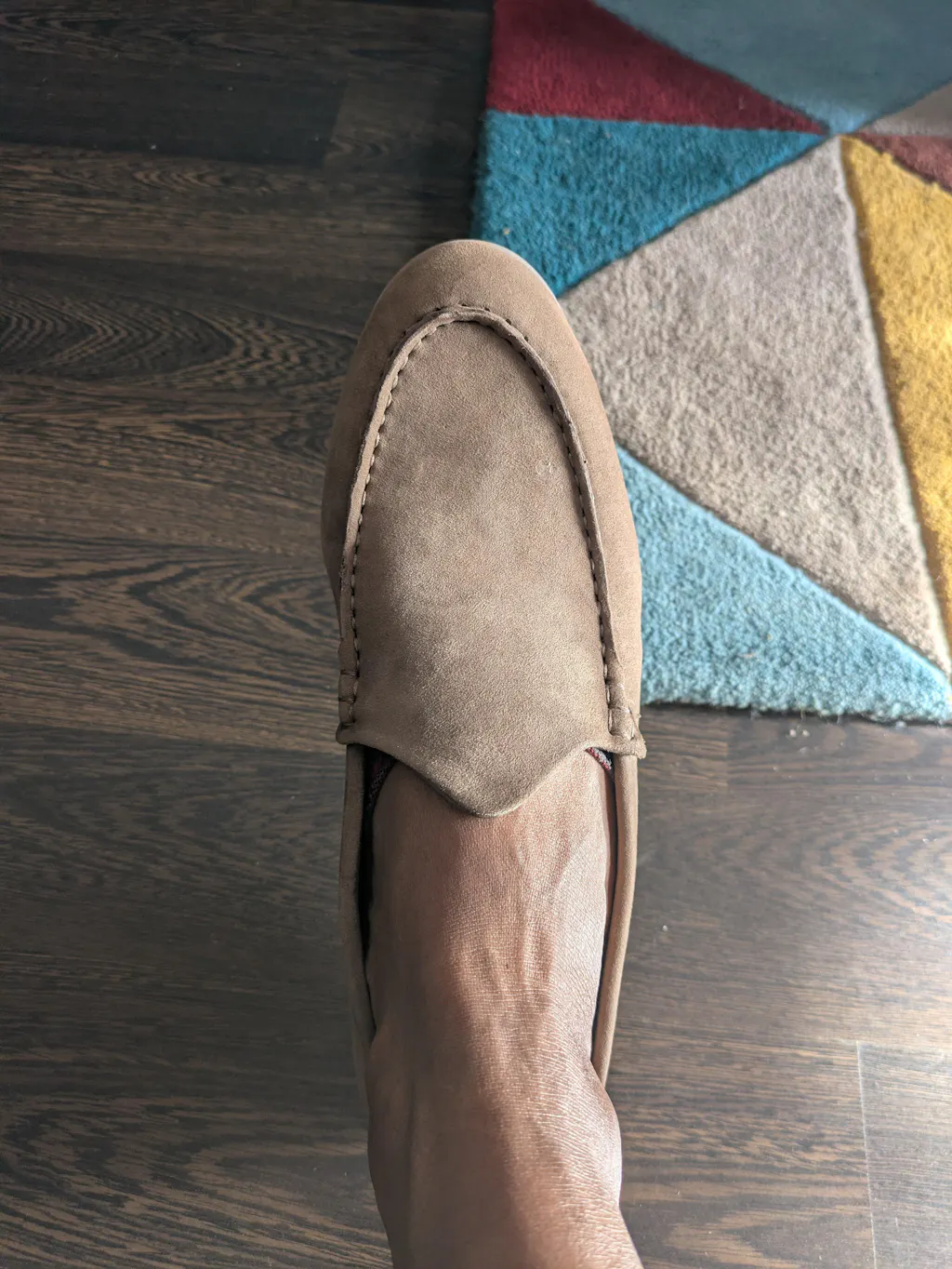 Crafted from 100% lamb suede featuring sleek, sharp lines and a hand-sewn vamp plug.